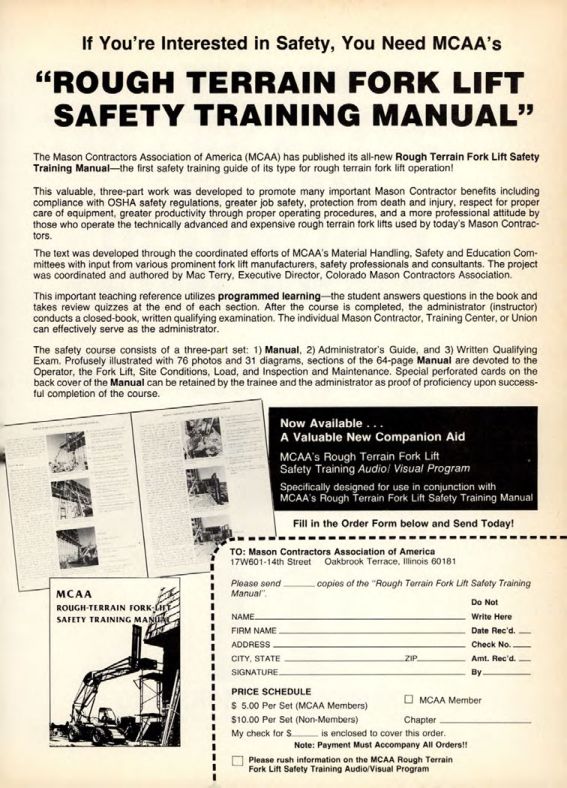 The Mason Contractors Association of America (MCAA) has published its all-new Rough Terrain Fork Lift Safety Training Manual, the first safety training guide of its type for rough terrain fork lift operation!
