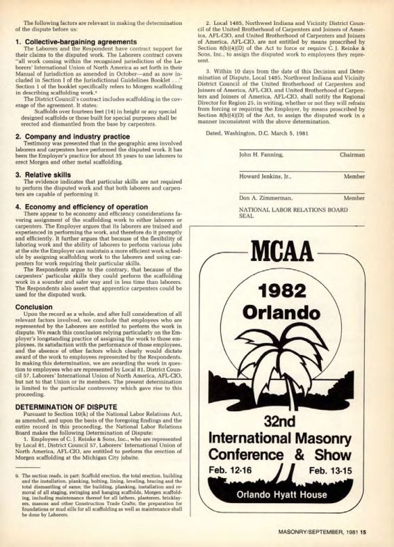 9. The section reads, in part: Scaffold erection, the total erection, building and the installation, planking, bolting, lining, leveling, bracing and the total dismantling of same; the building, planking, installation and removal of all staging, swinging and hanging scaffolds. Morgen scaffolding, including maintenance thereof for all lathers, plasterers, bricklayers, masons and other Construction Trade Crafts; the preparation for foundations or mud sills for all scaffolding as well as maintenance shall be done by Laborers.