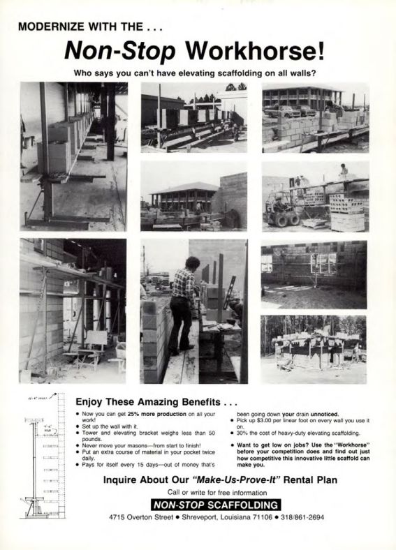 Now you can get 25% more production on all your work! Set up the wall with it. Tower and elevating bracket weighs less than 50 pounds. Never move your masons from start to finish! Put an extra course of material in your pocket twice daily. Pays for itself every 15 days out of money that's been going down your drain unnoticed. Pick up $3.00 per linear foot on every wall you use it on. 30% the cost of heavy-duty elevating scaffolding.