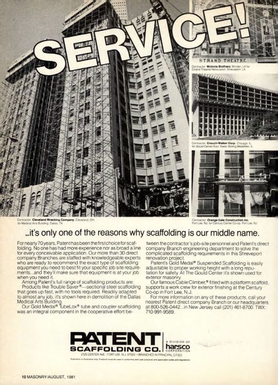 Among Patent's full range of scaffolding products are: Products like Trouble Saver-sectional steel scaffolding that goes up fast, with no tools required. Readily adapted to almost any job, it's shown here in demolition of the Dallas Medical Arts Building.