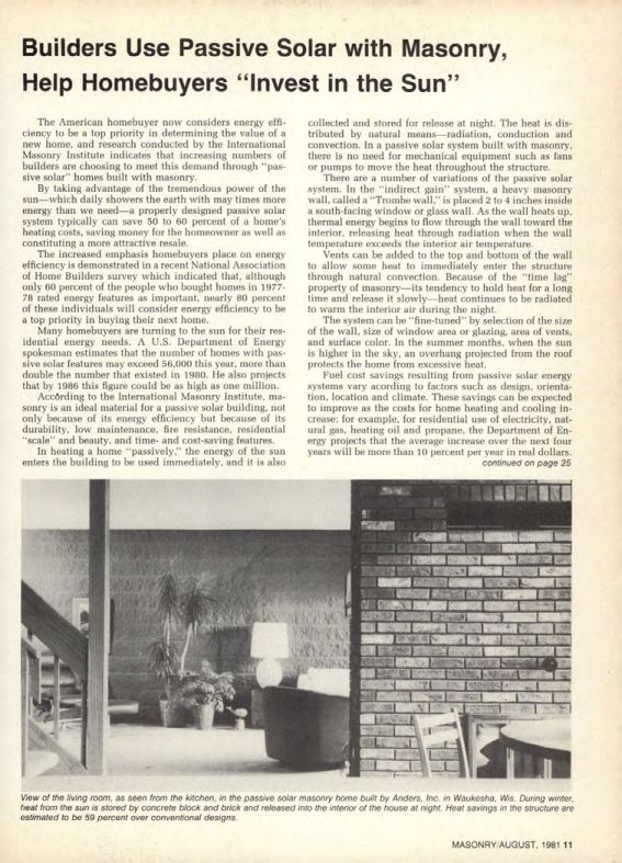 The American homebuyer now considers energy efficiency to be a top priority in determining the value of a new home, and research conducted by the International Masonry Institute indicates that increasing numbers of builders are choosing to meet this demand through "passive solar" homes built with masonry.