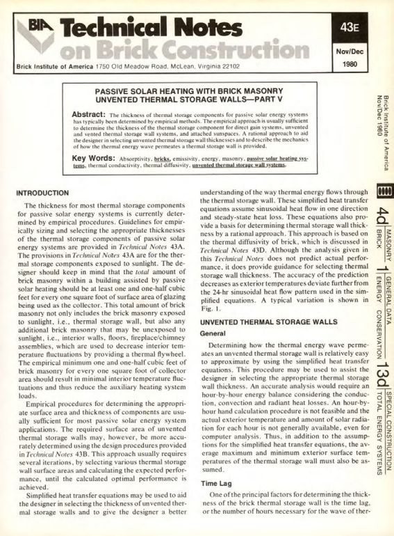 The thickness for most thermal storage components for passive solar energy systems is currently determined by empirical procedures. Guidelines for empirically sizing and selecting the appropriate thicknesses of the thermal storage components of passive solar energy systems are provided in Technical Notes 43A. The provisions in Technical Notes 43A are for the thermal storage components exposed to sunlight. The designer should keep in mind that the total amount of brick masonry within a building assisted by passive solar heating should be at least one and one-half cubic feet for every one square foot of surface area of glazing being used as the collector. This total amount of brick masonry not only includes the brick masonry exposed to sunlight, i.e.. thermal storage wall, but also any additional brick masonry that may be unexposed to sunlight, i.c., interior walls, floors, fireplace/chimney assemblies, which are used to decrease interior temperature fluctuations by providing a thermal flywheel. The empirical minimum one and one-half cubic feet of brick masonry for every one square foot of collector area should result in minimal interior temperature fluctuations and thus reduce the auxiliary heating system loads.
