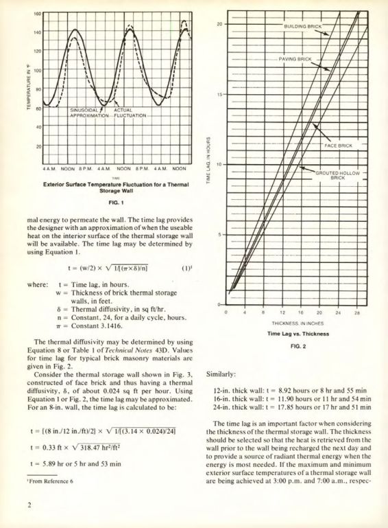 mal energy to permeate the wall. The time lag provides the designer with an approximation of when the useable heat on the interior surface of the thermal storage wall will be available. The time lag may be determined by using Equation 1.