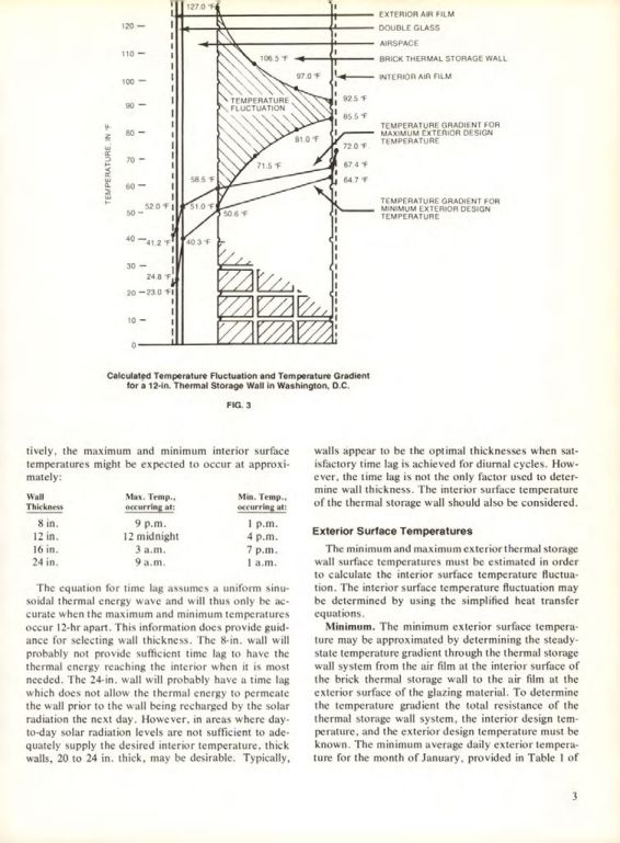 The equation for time lag assumes a uniform sinusoidal thermal energy wave and will thus only be accurate when the maximum and minimum temperatures occur 12-hr apart. This information does provide guidance for selecting wall thickness. The 8-in. wall will probably not provide sufficient time lag to have the thermal energy reaching the interior when it is most needed. The 24-in. wall will probably have a time lag which does not allow the thermal energy to permeate the wall prior to the wall being recharged by the solar radiation the next day. However, in areas where day-to-day solar radiation levels are not sufficient to adequately supply the desired interior temperature, thick walls, 20 to 24 in. thick, may be desirable. Typically, walls appear to be the optimal thicknesses when satisfactory time lag is achieved for diurnal cycles. However, the time lag is not the only factor used to determine wall thickness. The interior surface temperature of the thermal storage wall should also be considered.