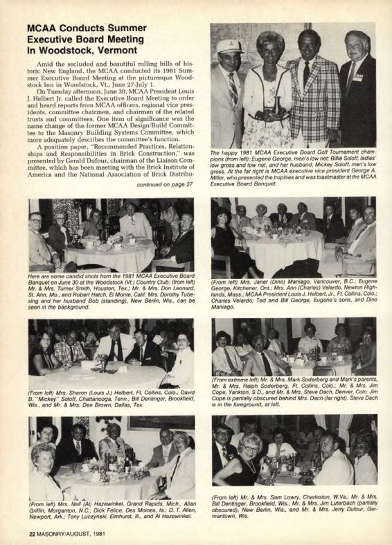 Here are some candid shots from the 1981 MCAA Executive Board Banquet on June 30 at the Woodstock (Vt.) Country Club: (from left) Mr. & Mrs. Turner Smith, Houston, Tex.; Mr. & Mrs. Don Leonard, St. Ann, Mo., and Robert Hatch, El Monte, Calif. Mrs. Dorothy Tubesing and her husband Bob (standing), New Berlin, Wis., can be seen in the background.