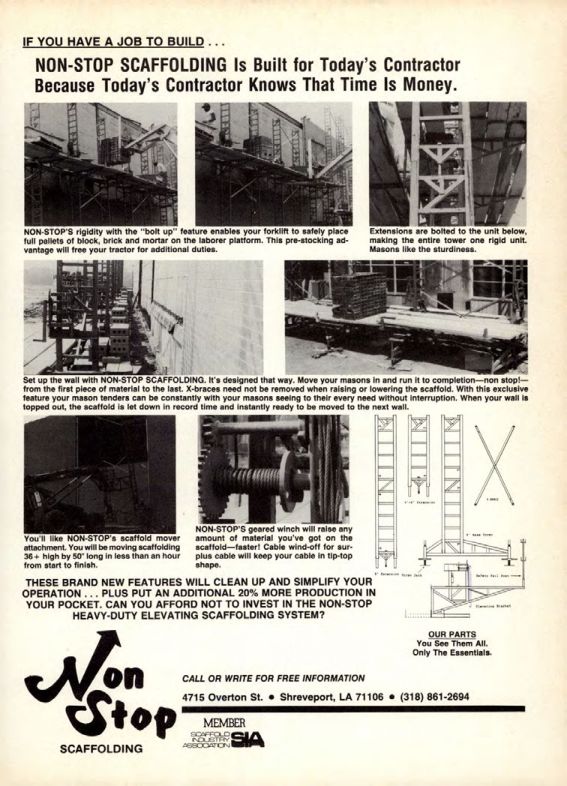 THESE BRAND NEW FEATURES WILL CLEAN UP AND SIMPLIFY YOUR OPERATION... PLUS PUT AN ADDITIONAL 20% MORE PRODUCTION IN YOUR POCKET. CAN YOU AFFORD NOT TO INVEST IN THE NON-STOP HEAVY-DUTY ELEVATING SCAFFOLDING SYSTEM?