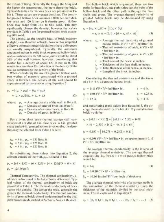 For hollow brick which is grouted, there are two paths for heat flow, one path is through the webs of the hollow brick and the other path is through the face shells and grout. The average thermal resistivity of grouted hollow brick may be determined by using Equation 3: