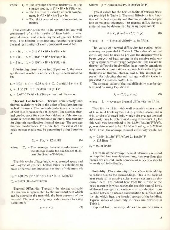 The values of thermal diffusivity for typical brick masonry are provided in Table 1. The value of thermal diffusivity may be used to provide the designer with a better concept of heat storage in the passive solar energy system thermal storage component. The use of the thermal diffusivity in simplified heat transfer equations may provide a more rational approach for selecting the thickness of thermal storage walls. The rational approach for selecting thermal storage wall thickness is provided in Technical Notes 43E.