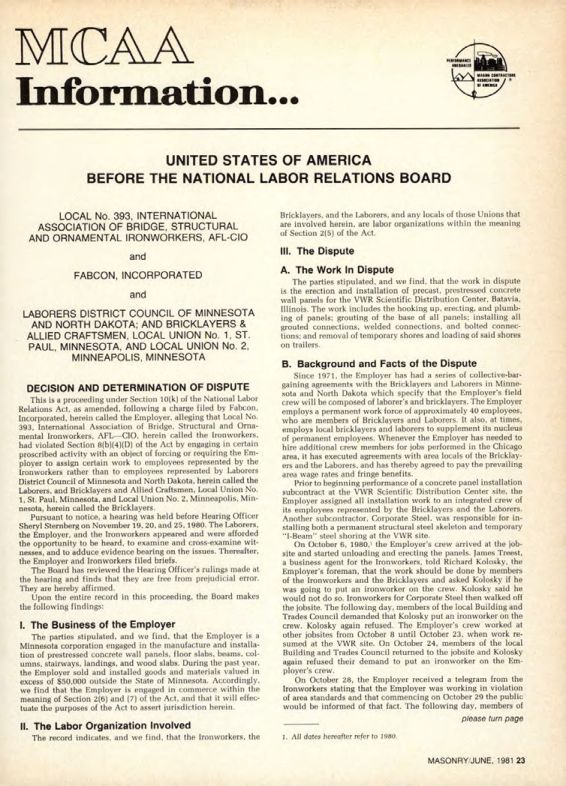 LOCAL No. 393, INTERNATIONAL ASSOCIATION OF BRIDGE, STRUCTURAL AND ORNAMENTAL IRONWORKERS, AFL-CIO and FABCON, INCORPORATED and LABORERS DISTRICT COUNCIL OF MINNESOTA AND NORTH DAKOTA; AND BRICKLAYERS & ALLIED CRAFTSMEN, LOCAL UNION No. 1, ST. PAUL, MINNESOTA, AND LOCAL UNION No. 2, MINNEAPOLIS, MINNESOTA