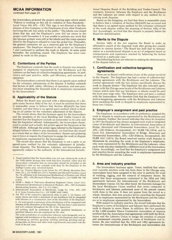 With respect to industry practice, the record indicates that the Employer's crews of bricklayers and laborers have performed the work in dispute in seven States. In addition, the vice president of the 1,500-member Mason Contractors Association of America testified that the Association had agreements with both the Bricklayers and the Laborers Union to assign the erection of precast and prestressed concrete panels to crews of bricklayers and laborers. He also testified that the 1954 and 1962 agreements between the Internationals of the Bricklayers and Ironworkers did