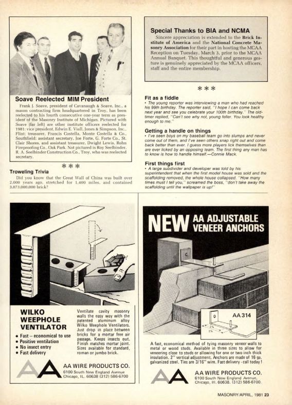 Frank J. Soave, president of Cavanaugh & Soave, Inc., a mason contracting firm headquartered in Troy, has been reelected to his fourth consecutive one-year term as president of the Masonry Institute of Michigan. Pictured with Soave (far left) are other institute officers reelected for 1981: vice president, Edwin E. Viall, Jones & Simpson, Inc., Flint; treasurer, Francis Costella, Monte Costella & Co., Southfield; assistant secretary, Joe Forte, G. Forte Co., St. Clair Shores, and assistant treasurer, Dwight Lewis, Rohn Fireproofing Co., Oak Park. Not pictured is Roy Seelbinder, R. A. Seelbinder Construction Co., Troy, who was reelected secretary.