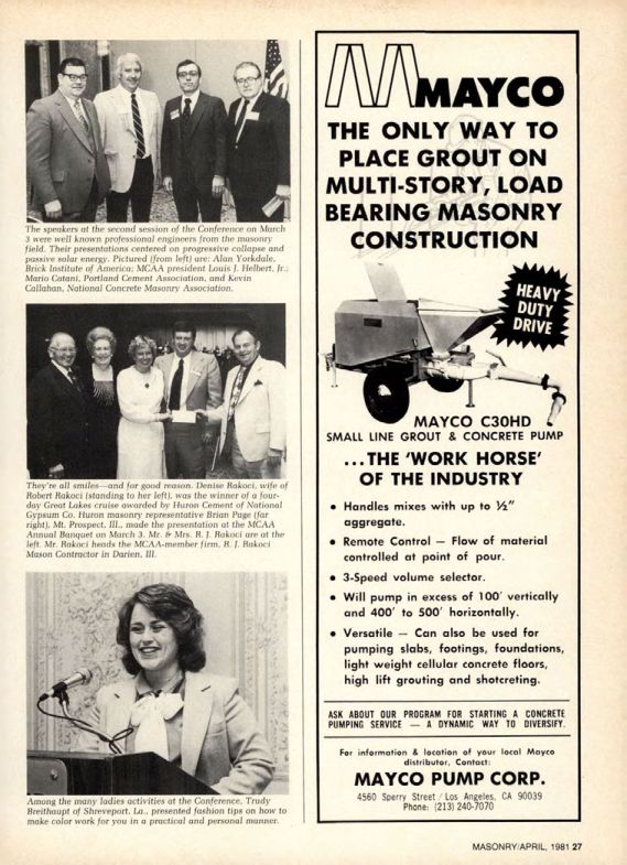 They're all smiles and for good reason. Denise Rakoci, wife of Robert Rakoci (standing to her left), was the winner of a four-day Great Lakes cruise awarded by Huron Cement of National Gypsum Co. Huron masonry representative Brian Page (far right), Mt. Prospect, III., made the presentation at the MCAA Annual Banquet on March 3. Mr. & Mrs. R. J. Rakoci are at the left. Mr. Rakoci heads the MCAA-member firm, R. J. Rakoci Mason Contractor in Darien, III.