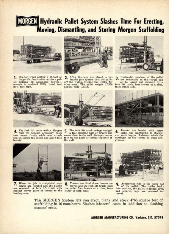 This MORGEN System lets you erect, plank and stock 4766 square feet of scaffolding in 16 man-hours. Slashes laborers' costs in addition to slashing masons' costs.