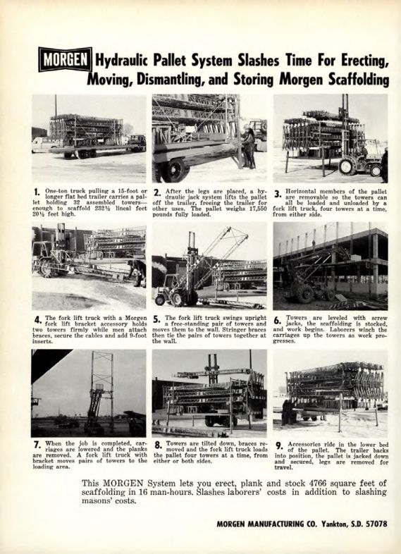 Bob Kahler Masonry Co., Norfolk, Nebr., won five different bids he had made, figuring on using tubular scaffolding. But he tried Morgen Scaffolding on the first job and found eight masons turned in the work he expected to get from ten. So he bought more Morgen Scaffolding for a shopping center that involved 400,000 brick and 450,000 Saxon brick. He not only got a 25% increase in masons' production but speeded up the whole job so it was completed ahead of schedule.