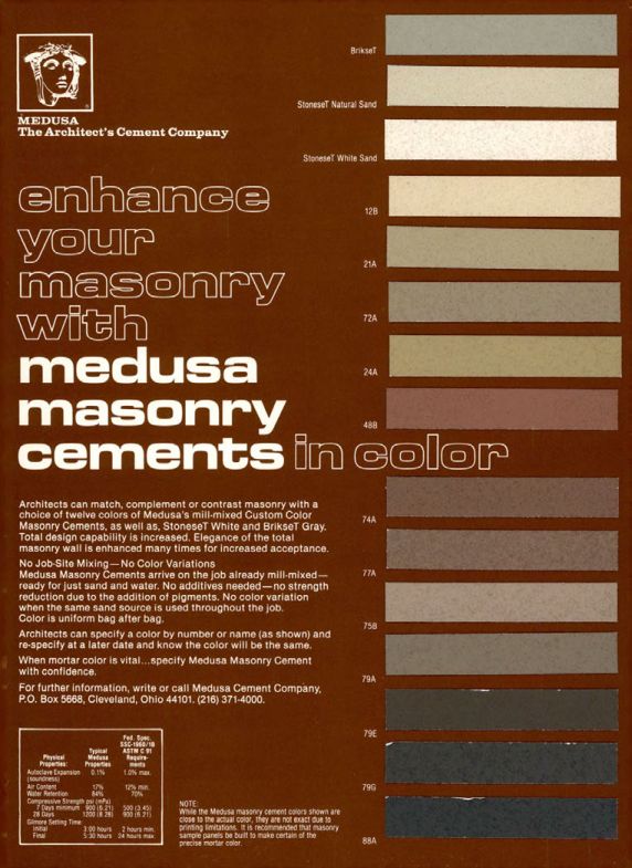 While the Medusa masonry cement colors shown are close to the actual color, they are not exact due to printing limitations. It is recommended that masonry sample panels be built to make certain of the precise mortar color.