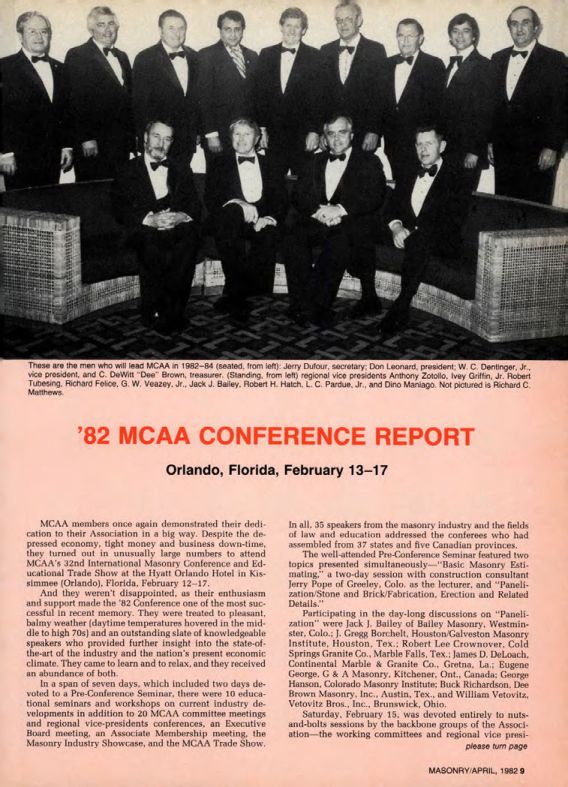 These are the men who will lead MCAA in 1982-84 (seated, from left): Jerry Dufour, secretary; Don Leonard, president; W. C. Dentinger, Jr., vice president, and C. DeWitt "Dee" Brown, treasurer. (Standing, from left) regional vice presidents Anthony Zotollo, Ivey Griffin, Jr. Robert Tubesing, Richard Felice, G. W. Veazey, Jr., Jack J. Bailey, Robert H. Hatch, L. C. Pardue, Jr., and Dino Dino Maniago. Not pictured is Richard C. Matthews.
