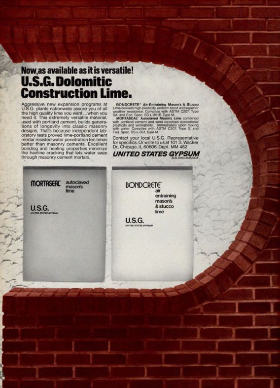 U.S.G. Dolomitic Construction Lime. Aggressive new expansion programs at U.S.G. plants nationwide assure you of all the high quality lime you want...when you need it. This extremely versatile material, used with portland cement, builds generations of longevity into classic masonry designs. That's because independent laboratory tests proved lime-portland cement mortar resisted water penetration ten times better than masonry cements. Excellent bonding and healing properties minimize the hairline cracking that lets water seep through masonry cement mortars.