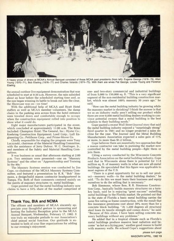 A happy group of diners at MCAA's Annual Banquet consisted of these MCAA past presidents (from left): Eugene George (1978-79), Allen Young (1970-71), Bob Ebeling (1976-77) and Charles Velardo (1974-75). With them are wives Pat George, Louise Young and Florence Ebeling.