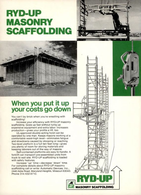 Increase "up" time-decrease "down" time. For complete details about RYD-UP masonry scaffolding call or write: Automatic Devices, Inc., 2440 Adie Road, Maryland Heights, Missouri 63043. Phone 314/432-5710.