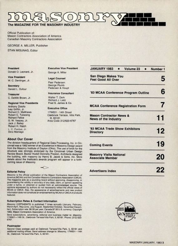 Masonry (USPS469470) is published 7 times annually (January, February, March/April, May/June, July/August, September/October, November/December). Subscription rate: $6.50 per year; Canada $7.50 U.S. currency. Copyright 1983, Mason Contractors Association of America.