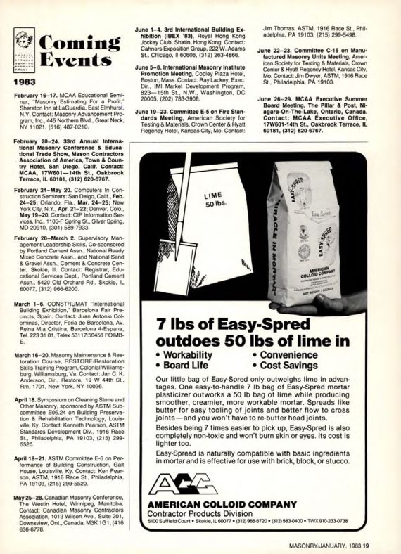 33rd Annual International Masonry Conference & Educational Trade Show, Mason Contractors Association of America, February 20-24, Town & Country Hotel, San Diego, Calif. Contact: MCAA, 17W601-14th St., Oakbrook Terrace, IL 60181, (312) 620-6767.