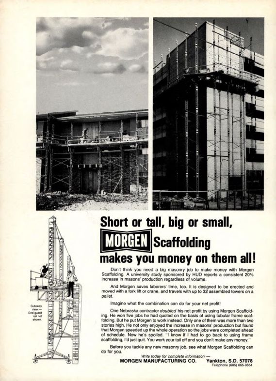 One Nebraska contractor doubled his net profit by using Morgen Scaffolding. He won five jobs he had quoted on the basis of using tubular frame scaffolding. But he put Morgen to work instead. Only one of them was more than two stories high. He not only enjoyed the increase in masons' production but found that Morgen speeded up the whole operation so the jobs were completed ahead of schedule. Now he's spoiled. "I know if I had to go back to using frame scaffolding, I'd just quit. You work your tail off and you don't make any money."