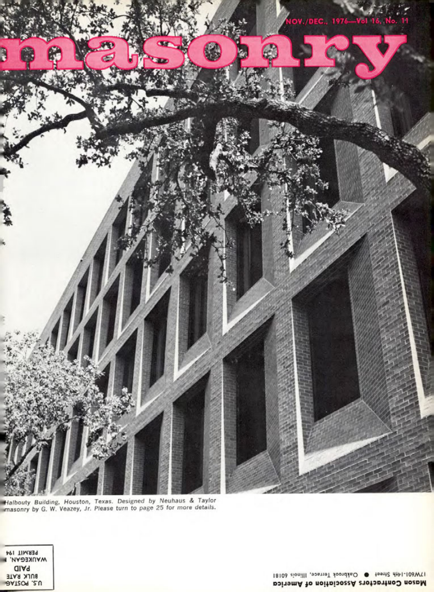 Halbouty Building, Houston, Texas. Designed by Neuhaus & Taylor masonry by G. W. Veazey, Jr. Please turn to page 25 for more details.