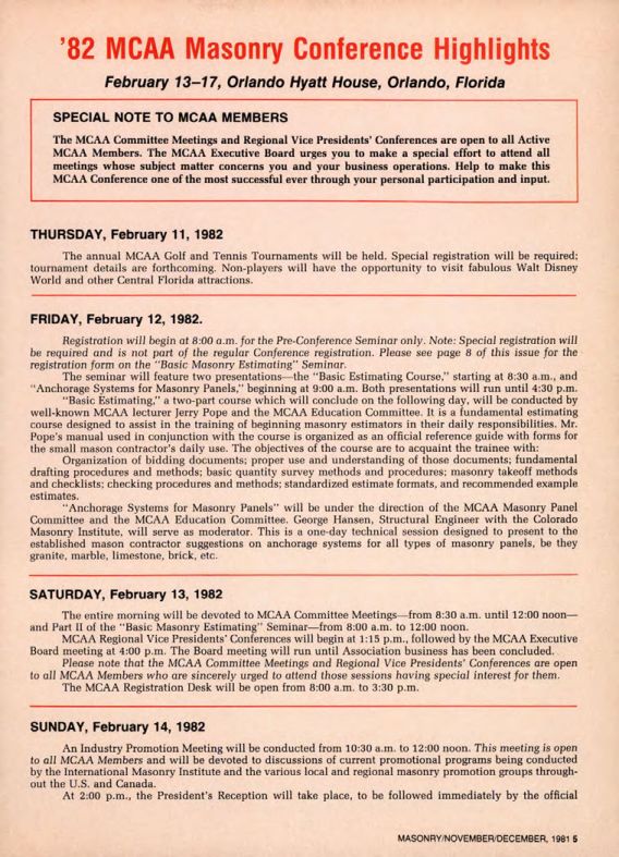 Registration will begin at 8:00 a.m. for the Pre-Conference Seminar only. Note: Special registration will be required and is not part of the regular Conference registration. Please see page 8 of this issue for the registration form on the "Basic Masonry Estimating" Seminar.