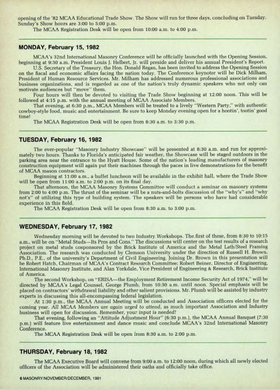 MCAA's 32nd International Masonry Conference will be officially launched with the Opening Session beginning at 9:30 a.m. President Louis J. Helbert. Jr. will preside and deliver his annual President's Report.