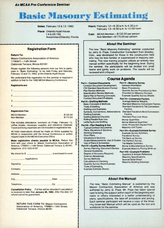The new "Basic Estimating Manual is published by the Mason Contractors Association of America and was authored by Jerry G. Pope. Mr. Pope has taken special care to bring the subject within reach of the beginning estimator or others interested in a better understanding of plans, specifications, the take-off procedure and pricing. Each seminar participant will receive a copy of the three-ring loose-leaf Manual which will be used as the text and workbook for the seminar.