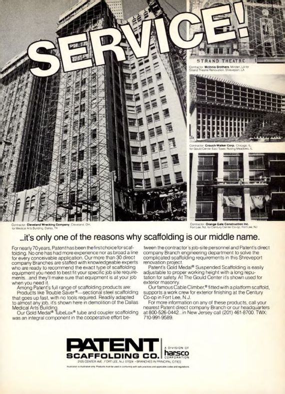 Among Patent's full range of scaffolding products are: Products like Trouble Saver-sectional steel scaffolding that goes up fast, with no tools required. Readily adapted to almost any job, it's shown here in demolition of the Dallas Medical Arts Building