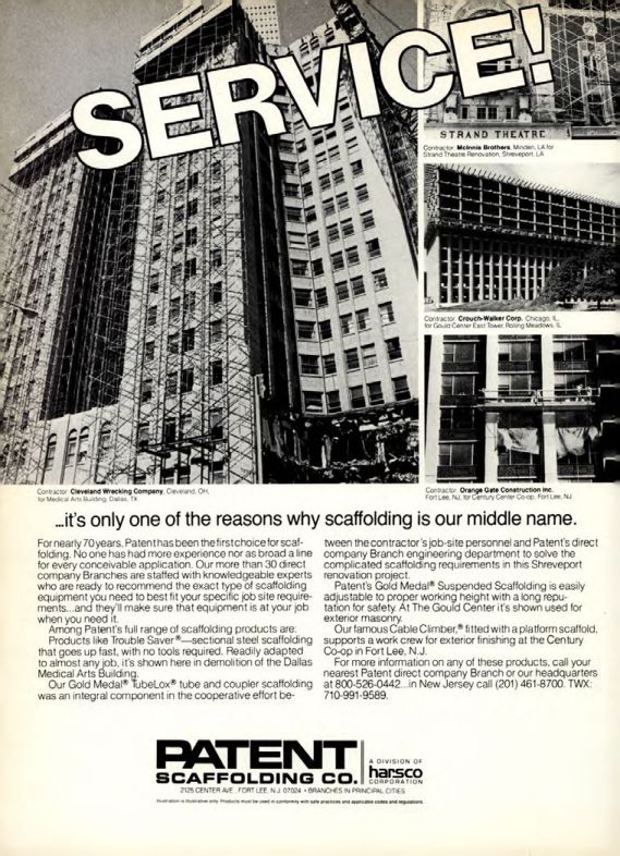 Among Patent's full range of scaffolding products are: Products like Trouble Saver-sectional steel scaffolding that goes up fast, with no tools required. Readily adapted to almost any job, it's shown here in demolition of the Dallas Medical Arts Building.