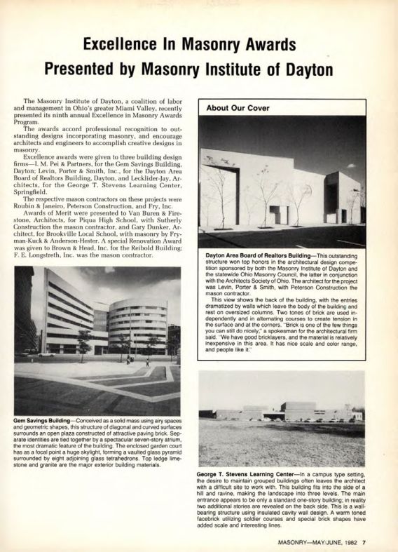 Excellence awards were given to three building design firms-I. M. Pei & Partners, for the Gem Savings Building, Dayton; Levin, Porter & Smith, Inc., for the Dayton Area Board of Realtors Building, Dayton, and Lecklider-Jay, Architects, for the George T. Stevens Learning Center, Springfield.