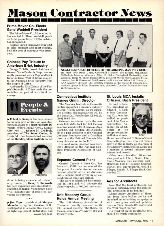 NEWLY INSTALLED OFFICERS OF THE ARIZONA MASONRY GUILD are (from left): David Gober, Churchhill Masonry, and Richard McKechnie, McKechnie Masonry, directors: Albert E. Fields. Springfield Contracting, vice president: Henry W. Slicer, Phoenix Brick, president: Wayne Webb, Arizona Block. director: Paul H. Rosensteel, Guild executive director, and Edward M. Young, Jr.. AAA Masonry, director. The secretary-treasurer of the statewide masonry promotional group is Ralph Burnham (not pictured). Zonolite Products Division, W. R. Grace & Co.