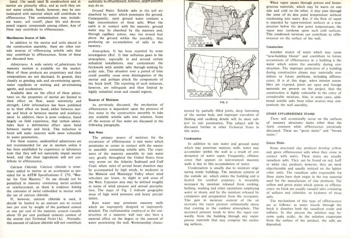 The primary source of moisture for the occurrence of efflorescence is rain water which penetrates or comes in contact with the masonry assembly containing soluble salts. The exposures of the masonry assembly to rain water vary greatly throughout the United States from very severe on the Atlantic Seaboard and Gulf Coast where rains of several hours duration may be accompanied by high winds, to moderate in the Midwest and Mississippi Valley where wind velocities are lower, to slight in arid areas of the West. Exposure area may be defined roughly in terms of wind pressure and annual precipitation. The maps of Fig. 2 indicate geographic areas of high wind pressures and heavy precipitation.
