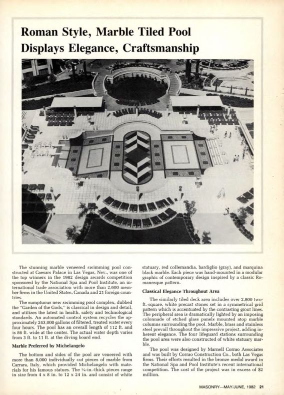 The stunning marble veneered swimming pool constructed at Caesars Palace in Las Vegas, Nev., was one of the top winners in the 1982 design awards competition sponsored by the National Spa and Pool Institute, an international trade association with more than 2,600 member firms in the United States, Canada and 21 foreign countries.