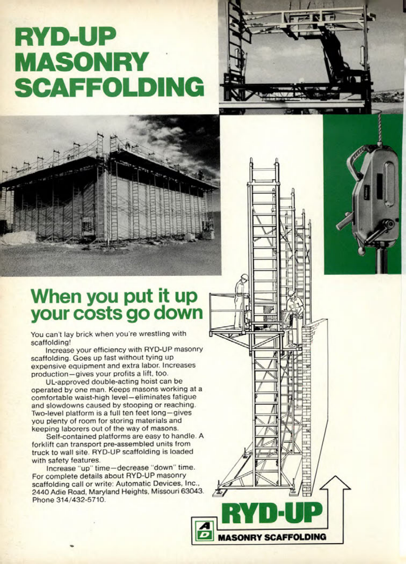 Increase "up" time-decrease "down" time. For complete details about RYD-UP masonry scaffolding call or write: Automatic Devices, Inc., 2440 Adie Road, Maryland Heights, Missouri 63043. Phone 314/432-5710.