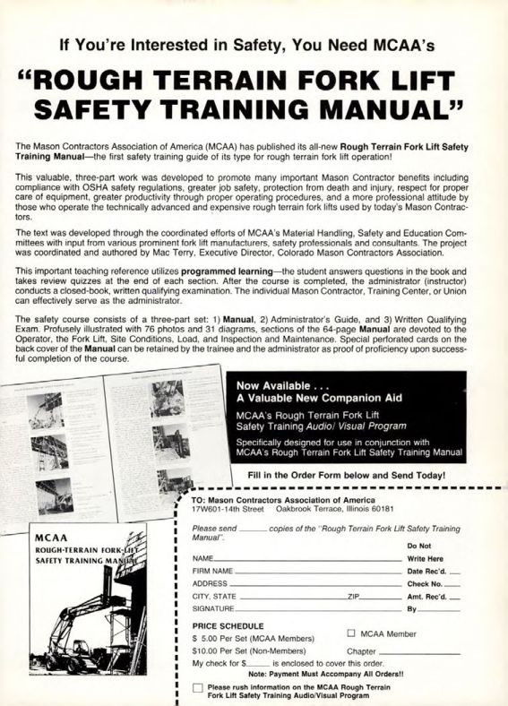 The Mason Contractors Association of America (MCAA) has published its all-new Rough Terrain Fork Lift Safety Training Manual-the first safety training guide of its type for rough terrain fork lift operation!