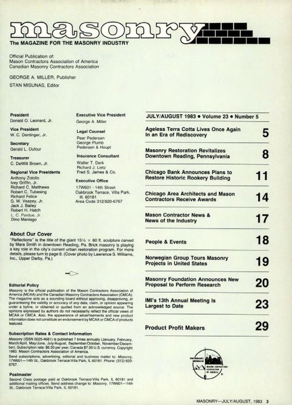 Masonry (ISSN 0025-4681) is published 7 times annually (January, February, March/April, May/June, July/August, September/October, November December). Subscription rate: $6.50 per year; Canada $7.50 U.S. currency. Copyright 1983. Mason Contractors Association of America.