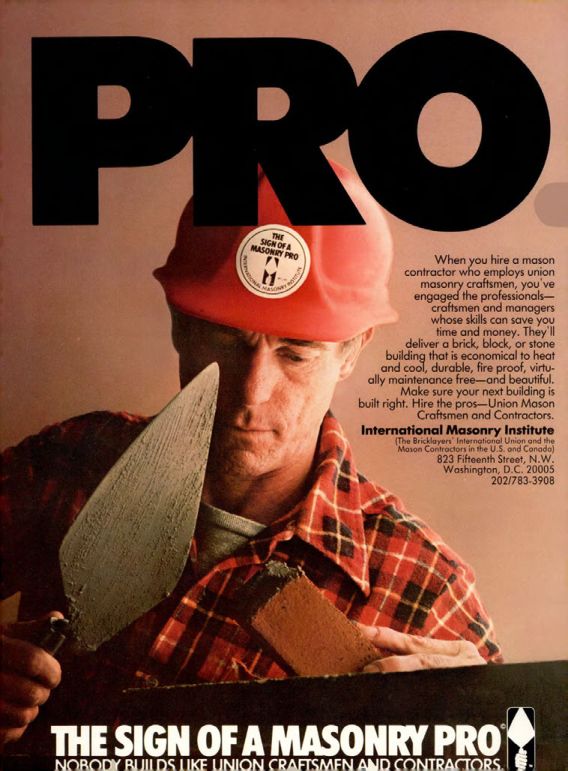 When you hire a mason contractor who employs union masonry craftsmen, you've engaged the professionals - craftsmen and managers whose skills can save you time and money. They'll deliver a brick, block, or stone building that is economical to heat and cool, durable, fire proof, virtually maintenance free - and beautiful. Make sure your next building is built right. Hire the pros - Union Mason Craftsmen and Contractors.