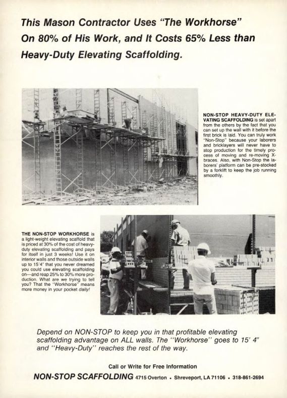 NON-STOP HEAVY-DUTY ELEVATING SCAFFOLDING is set apart from the others by the fact that you can set up the wall with it before the first brick is laid. You can truly work "Non-Stop" because your laborers and bricklayers will never have to stop production for the timely process of moving and re-moving X-braces. Also, with Non-Stop the laborers' platform can be pre-stocked by a forklift to keep the job running smoothly.