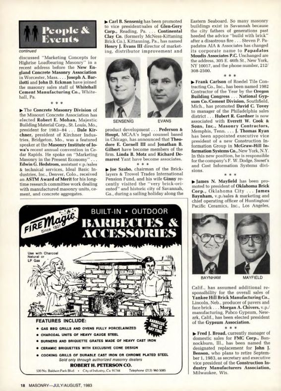 The Concrete Masonry Division of the Missouri Concrete Association has elected Robert E. Mohan, Majestic Building Material Corp., St. Louis, Mo., president for 1983-84. Dale Kirchner, president of Kirchner Industries, Bridgeton, Mo., was a featured speaker at the Masonry Institute of Iowa's recent annual convention in Cedar Rapids. He spoke on "Marketing Masonry in the Present Economy." Edwin G. Hedstrom, assistant v.p./sales & technical services, Ideal Basic Industries, Inc., Denver, Colo., received an ASTM Award of Merit for his long-time research committee work dealing with manufactured masonry units, cement, and concrete aggregates.