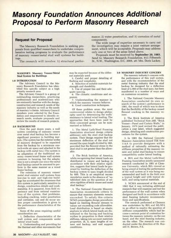 Proposals must be received by September 20, 1983. Send to: Masonry Research Foundation, 815 Fifteenth St., N.W., Washington, D.C. 2005, att: Mrs. Doris Lackey.