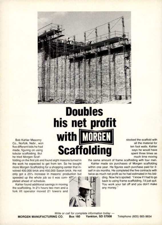Bob Kahler Masonry Co., Norfolk, Nebr., won five different bids he had made, figuring on using tubular scaffolding. But he tried Morgen Scaffolding on the first job and found eight masons turned in the work he expected to get from ten. So he bought more Morgen Scaffolding for a shopping center that involved 400,000 brick and 450,000 Saxon brick. He not only got a 25% increase in masons' production but speeded up the whole job so it was completed ahead of schedule.