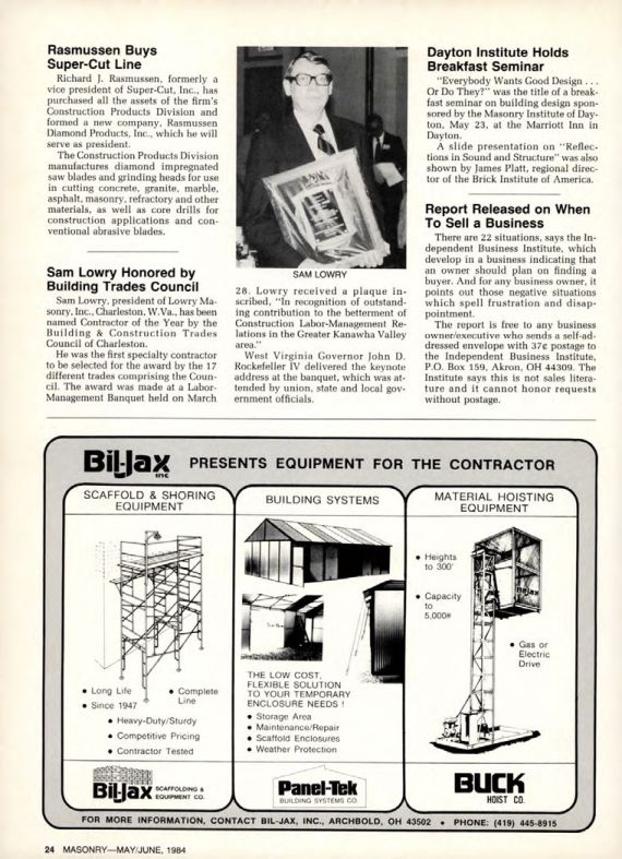 Sam Lowry, president of Lowry Masonry, Inc., Charleston, W.Va., has been named Contractor of the Year by the Building & Construction Trades Council of Charleston.