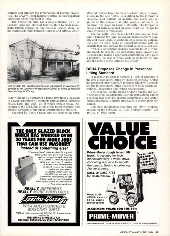 The Fitzpatrick farm has a long affiliation with the Lockport area and Material Service. Built by Irish immigrant Patrick Fitzpatrick, the house is located along the old stagecoach route between Chicago and Ottawa which is now Illinois 53. Fitzpatrick's home grew from a log cabin to a 1,200-acre property complete with quarried limestone house, barn, and wall-all of which remain today. According to the LPCI, this is one of the finest examples and earliest survivors of limestone construction in the area. Founded by Henry Crown and his brothers in 1919, Material Service began to make Lockport property acquisitions in the late 1920s. In addition to the Fitzpatrick property, land suitable for quarries and plants was acquired by the company. In later years, a portion of the holdings was given to Lewis University. The Fitzpatrick house and barn remained in good condition except for some evidence of vandalism.