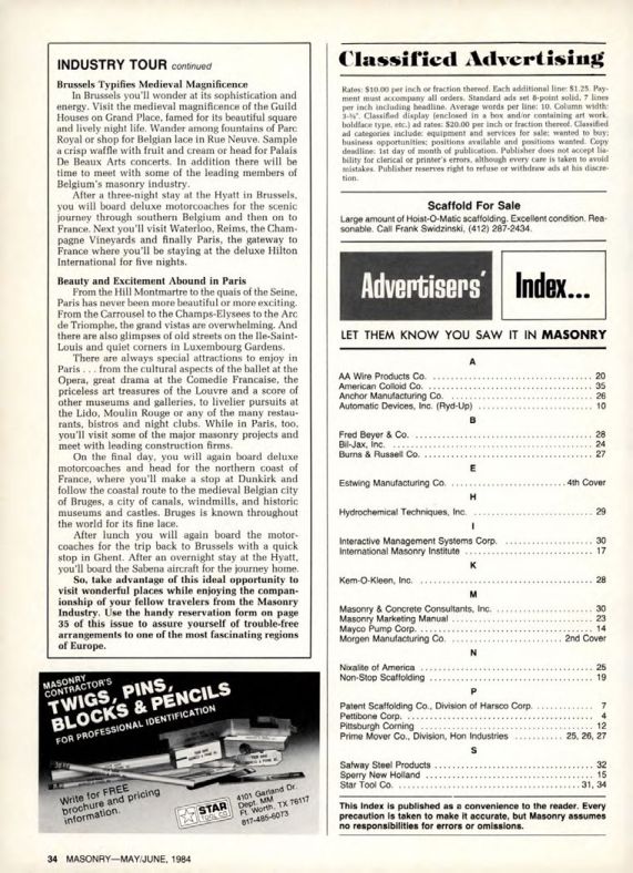 This Index is published as a convenience to the reader. Every precaution is taken to make it accurate, but Masonry assumes no responsibilities for errors or omissions.