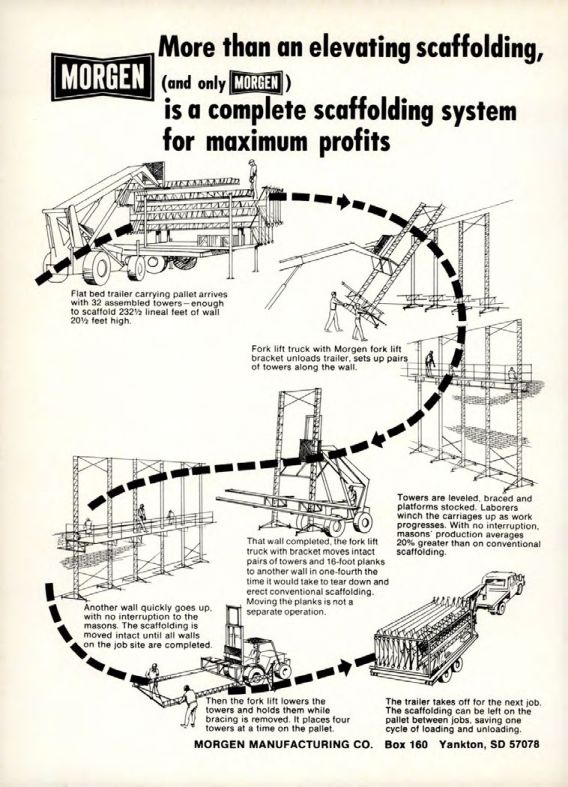 That wall completed, the fork lift truck with bracket moves intact pairs of towers and 16-foot planks to another wall in one-fourth the time it would take to tear down and erect conventional scaffolding. Moving the planks is not a separate operation.