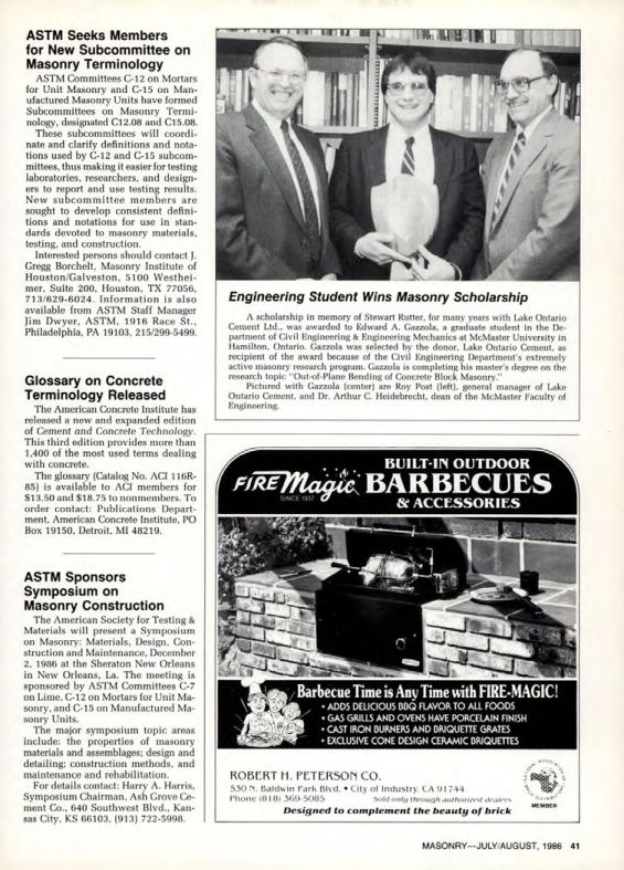 A scholarship in memory of Stewart Rutter, for many years with Lake Ontario Cement Ltd., was awarded to Edward A. Gazzola, a graduate student in the Department of Civil Engineering & Engineering Mechanics at McMaster University in Hamilton, Ontario. Gazzola was selected by the donor, Lake Ontario Cement, as recipient of the award because of the Civil Engineering Department's extremely active masonry research program. Gazzola is completing his master's degree on the research topic "Out-of-Plane Bending of Concrete Block Masonry."