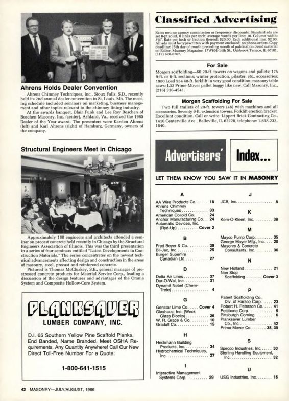 Morgen scaffolding-60 20-ft. towers on wagons and pallets: 175 9-ft. or 6-ft. sections; winter protection, pilaster, etc., accessories; 1980 Loed 554 48-ft. forklift in very good condition; masonry table saws: L32 Prime-Mover pallet buggy like new. Call Masonry, Inc., (216) 336-4541.